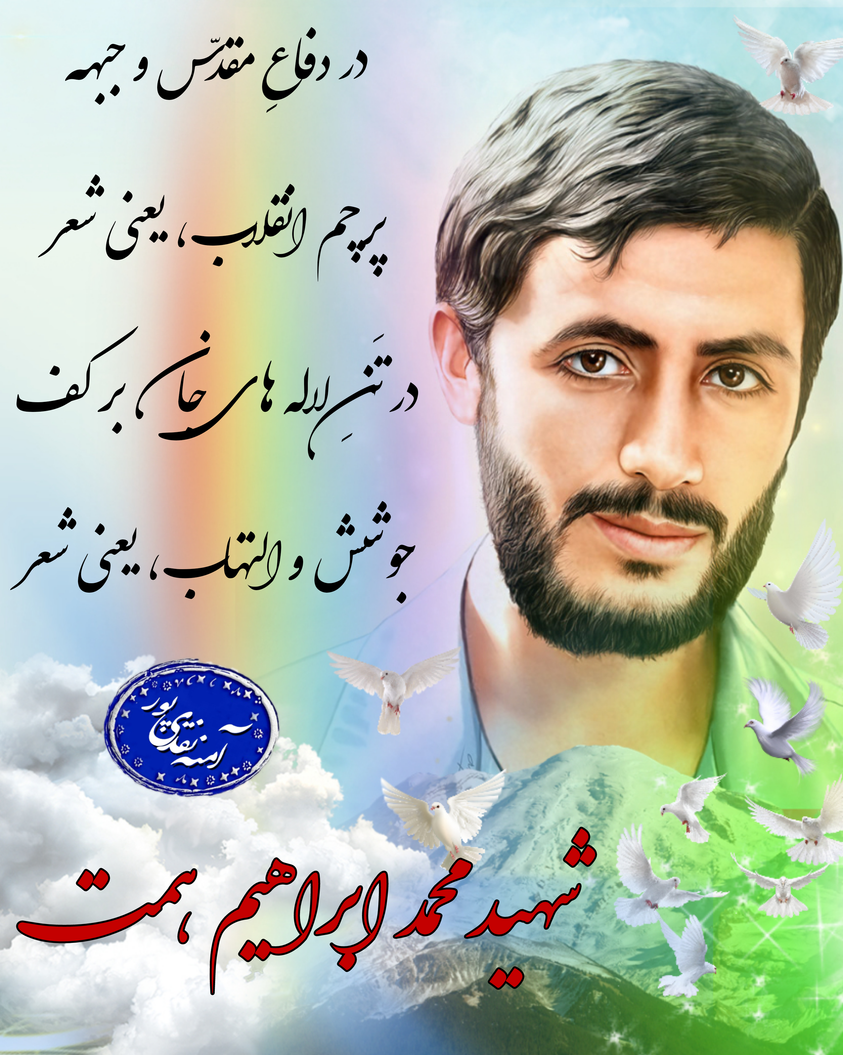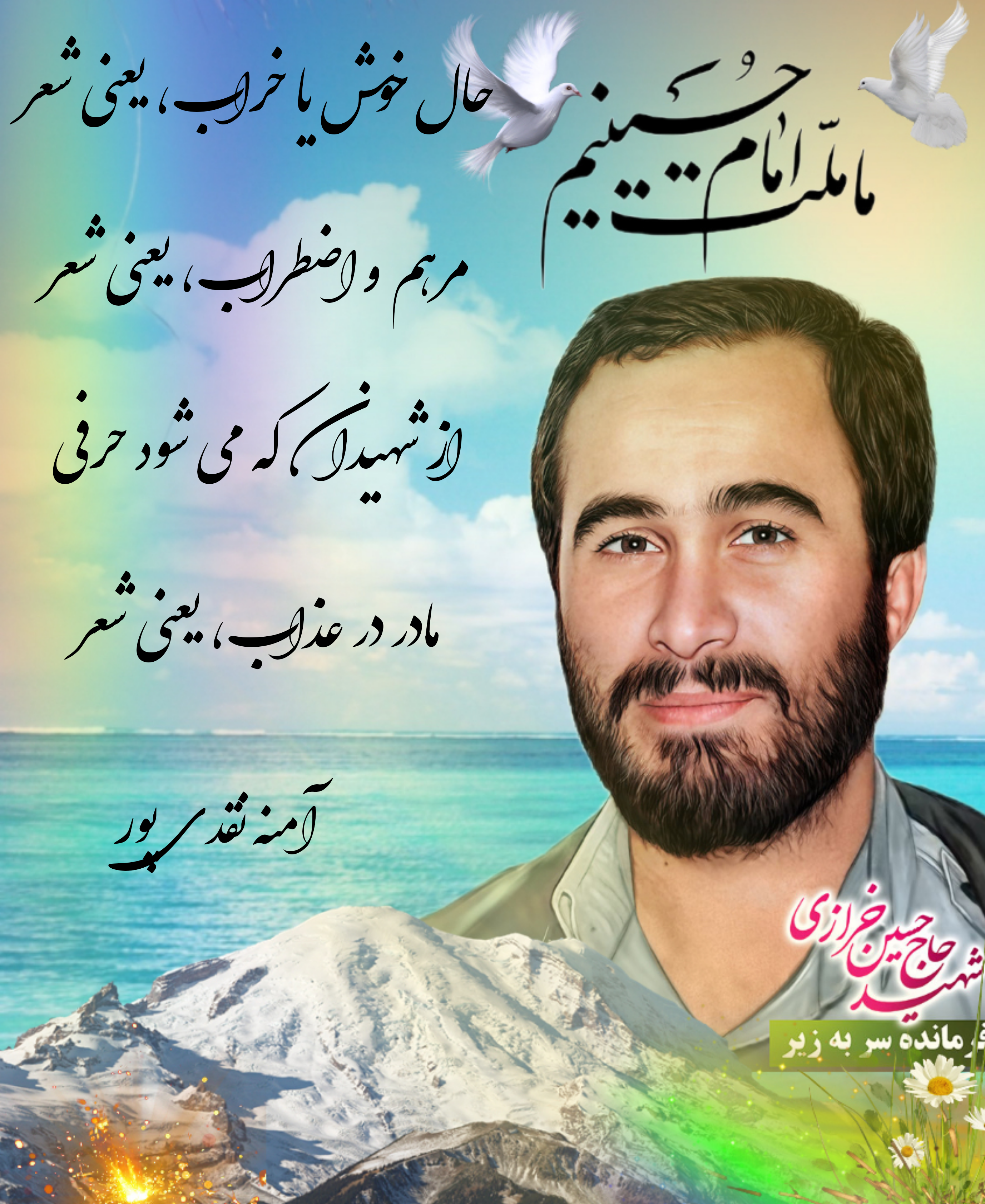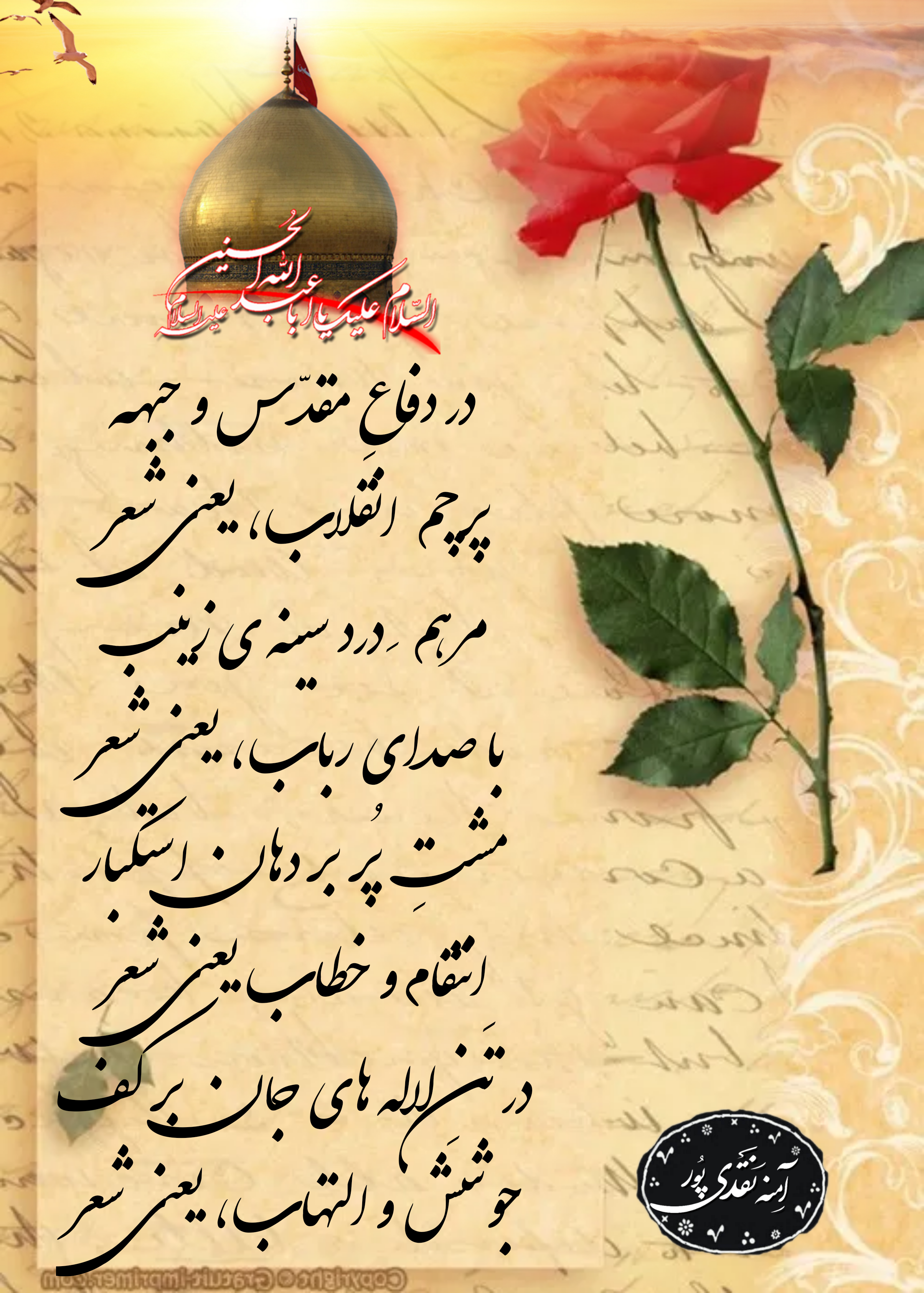 حال خوش یا خراب، یعنی شـعر مرهـم و اضطـراب، یعنـی شـعر از شـهیدان کـه میشـود حرفـی مـادر در عـذاب، یعنـی شـعر آنکه مصداق خنجر است به خصم قاطـع و پـر جـواب، یعنـی شـعر را کُنَـد بی نقـاب، یعنـی شـعر آنکـه ترفنـد و حُقّههـا را کـرد همچو نقشـی بر آب، یعنی شـعر آنکـه حیثیّت اَبَر قـدرت را کُنـَد چـون حبـاب، یعنی شـعر در دفـاعِ مقـدّس و جبهـه پرچـم انقلاب، یعنـی شـعر مرهـم ِ درد سـینهی زینـب بـا صـدای ربـاب، یعنـی شـعر میـن و بمـب و گلولـه و بـاروت خشم و خون و خشاب، یعنی شعر مشـتِ پُـر بـر دهـان اسـتکبار انتقـام و خطـاب یعنـی شـعر در تَنِ لاله هـای جـان بـر کـف جوشـش و التهـاب، یعنـی شـعر
