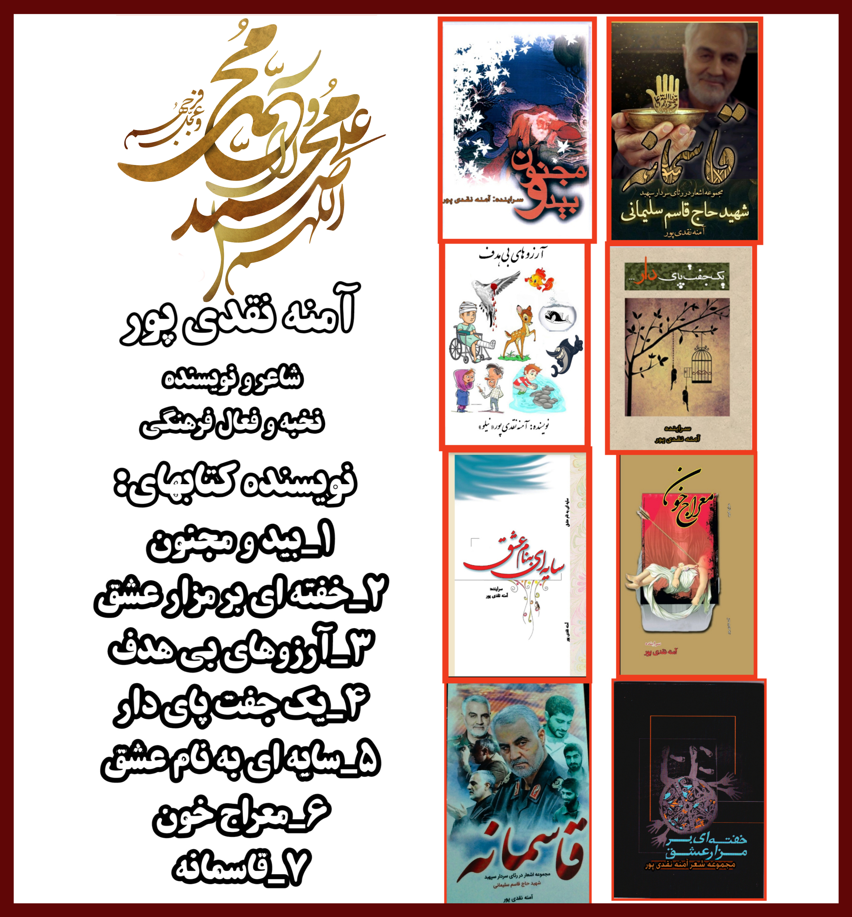 آمنه نقدی پور ساکن اصفهان کارشناس ادبیات سراینده کتابهای: "قاسمانه" "سایه ای به نام عشق" "معراج خون" "یک جفت پای دار" "بیدومجنون" "خفته ای برمزارعشق" "آرزوهای بی هدف" و چند اثر دیگر