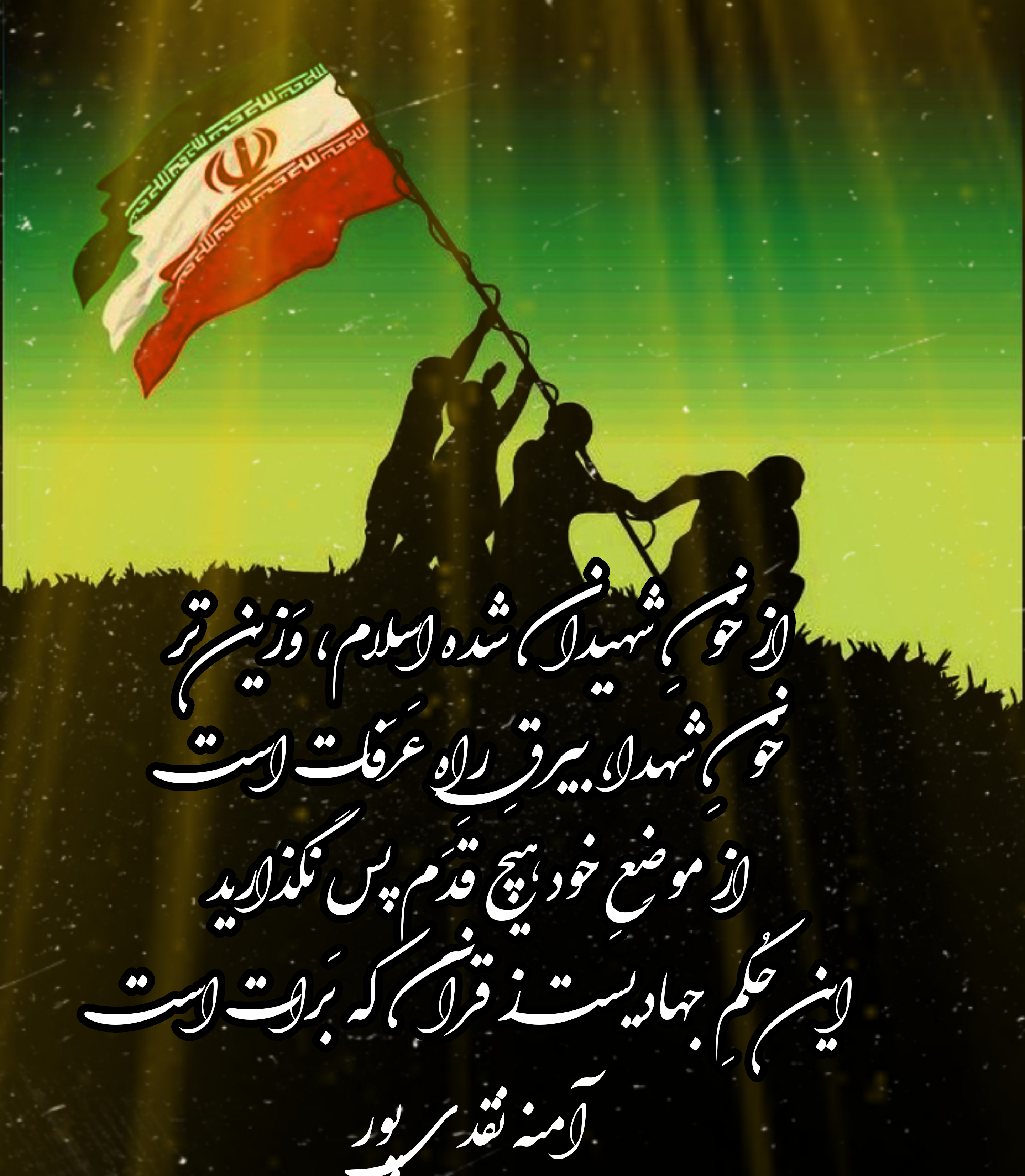 من پُر از توپ و تانک و خُمپاره ام من زَبونَم فِشَنگ و باروته قَدِّ صدتا رسانه ام وقتی دشمنیتون به دین مربوطه داعِش اصلا، سگِ کیه وقتی مذهبم خارِ چشمِ دَجّاله قُدرتم مثلِ بُمبِ هسته ایه حُکمِ تیرِ رژیمِ اِشغاله توی جبهه، جهاد و جانبازی مثلِ بُمبِ انرژی و شَعَفه عزَّت و دین و سربلندیِ ما خارِ چشمِ ترامپِ بی شرفه خیلی زوده که ما را بشناسین ما فداییِ راهِ الله ایم لَشکَرِ شیرمردِ ثارالله تیپِ حَقّ و سِپاهِ الله ایم کُفر و اِلحاد و اِرتِدادِ شما لکّه ی ننگه، خوکای هرزه دست از پا خطا کنید قطعا لَشکَرِ ما مُدافِعِ مَرزه مرز واسه سپاهِ ما یعنی اون حدودی که حقِّ مظلومه هرکُجای جهان، ضعیفی هست مَرزِ ما از دِفاع معلومه حکمِ پیروزیِ سِپاهِ قُدس اونچه دشمَن از اون کَف کرده اینه که با شُجاعَت و ایمان کفر و تکفیر را هدف کرده حُکمِ پیروزیِ سپاهِ ما سینه های سِپَر و ایمانه دستِ حق پشت ماست با قدرت ناجیِ ما خدای رحمانه ذِکرِ زهرا و یا علی و حسین حتّی وقتی که عرصه ها تَنگه مُعجزه می کنه برای سِپاه اسمِ زهرا، کلیدِ هر جنگه شاعر: آمنه نقدی پور از کتاب قاسمانه برچسبها: آمنه نقدی پور, نقدی پور, قاسمانه, عکسنوشته قاسم سلیمانی